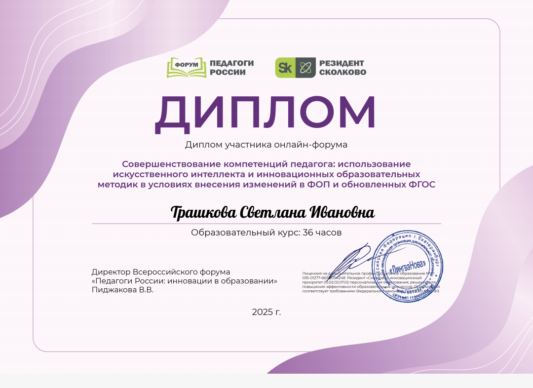 Диплом участника онлайн-форума"Совершенствование компетенций педагога: использование искусственного интеллекта и инновационных образовательных методик в условиях внесения изменений в ООП и обновленных ФГОС, Педагоги России, 36 ч, 18.11.2025