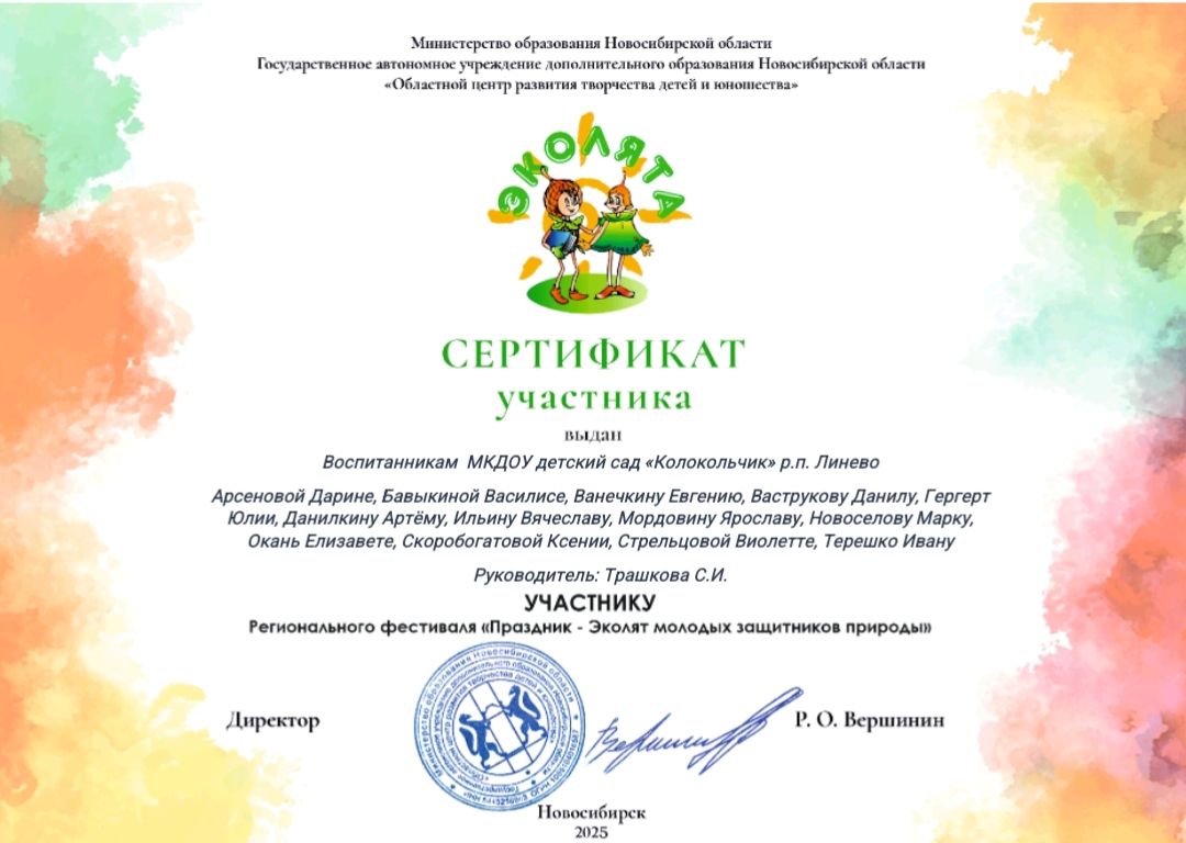 Сертификат участника регионального фестиваля "Праздник-Эколят молодых защитников природы", декабрь 2025, Мин. Обр. НСО