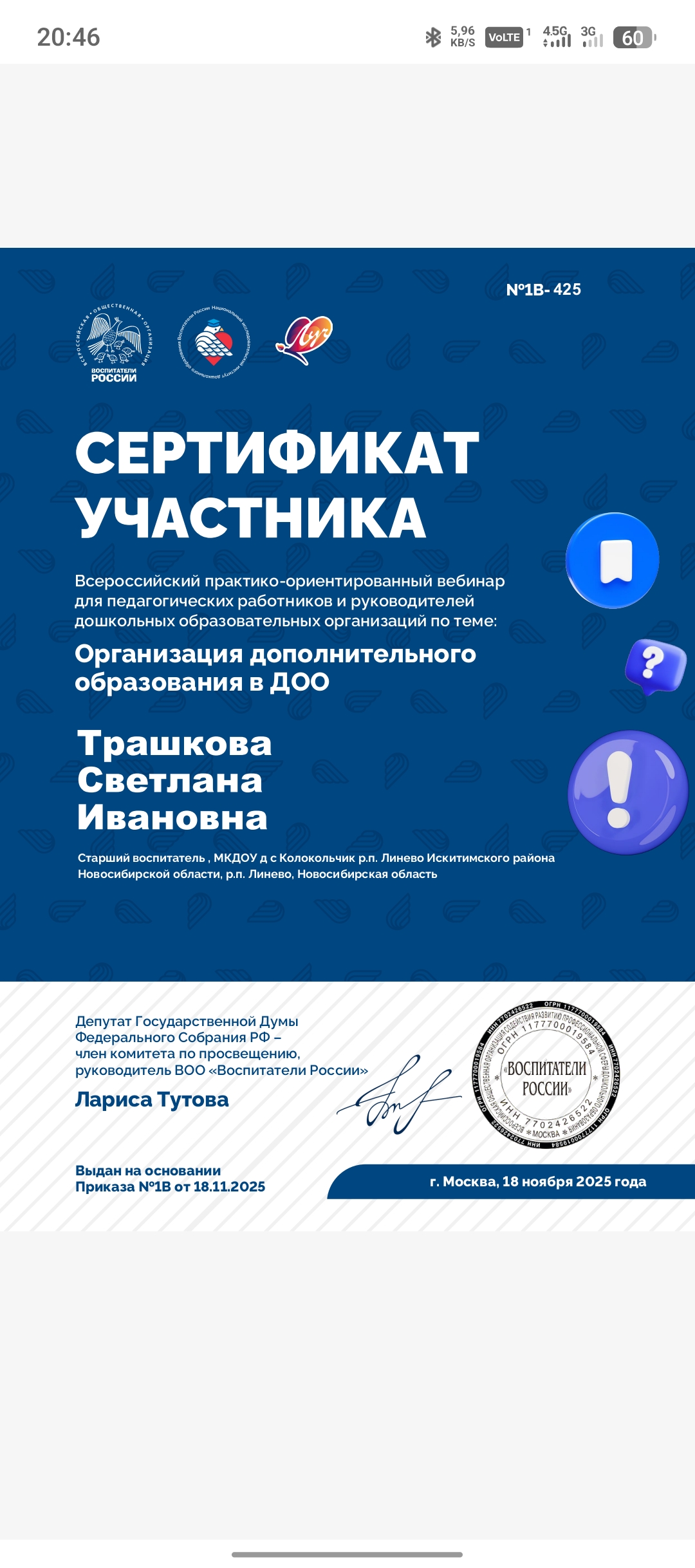 Сертификат участника всероссийского практико-оринтированного вебинара для педагогических работников и руководителей дошкольной образовательной организации по теме:"Организация дополнительного образования в ДяоО", Педагоги России, 18.11.2025