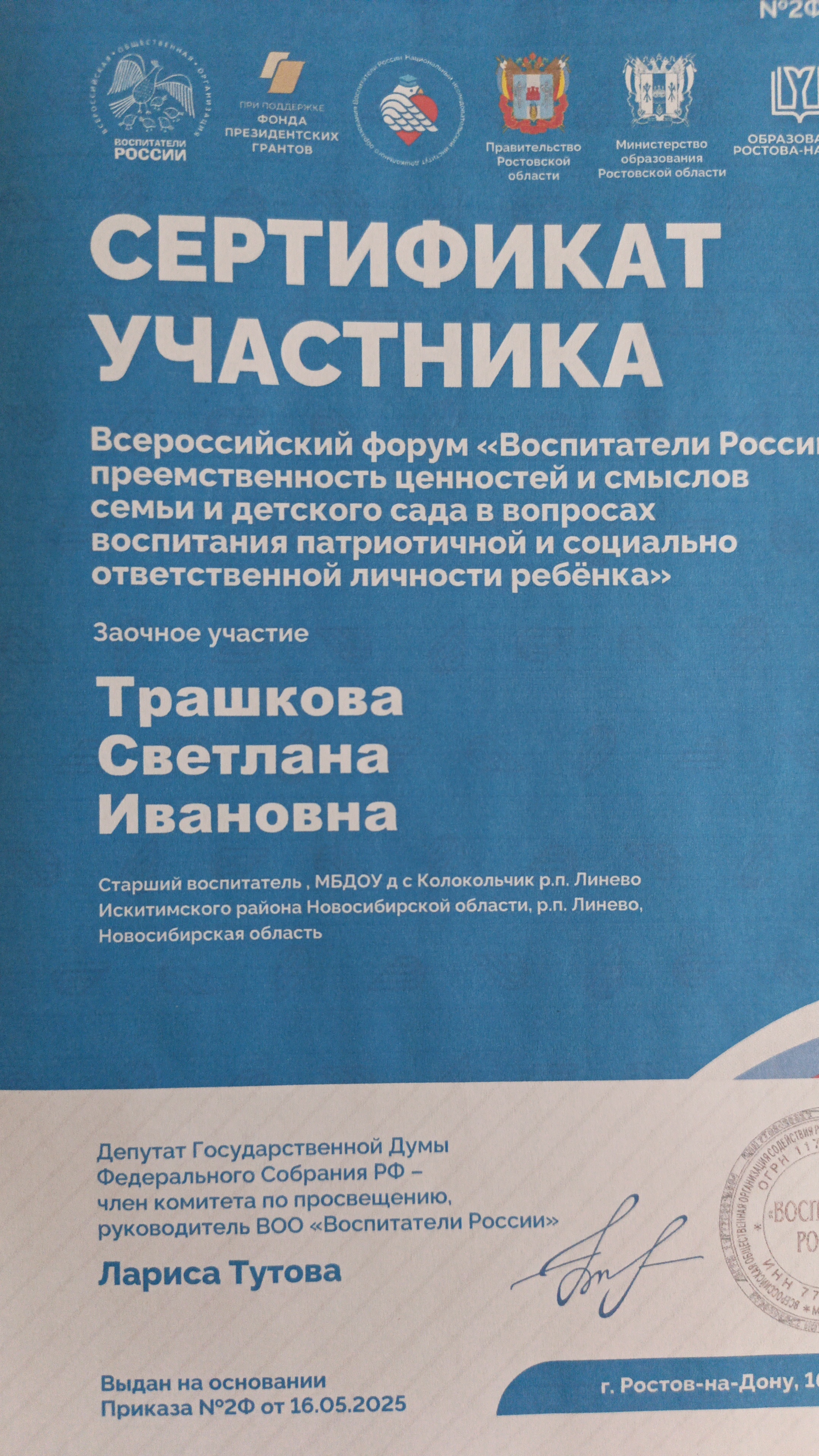 Сертификат участника Всероссийского форума Воспитатели России: преемственность ценностей и смыслов семьи и детского сада в вопросах воспитания патриотичной и социальной ответственной личности ребенка, 16.05.2025