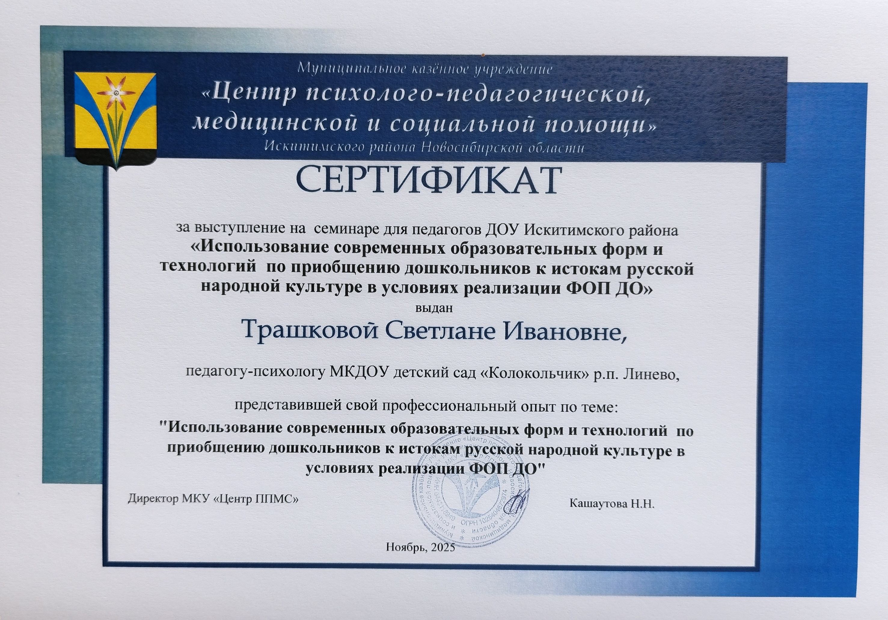 Сертификат за выступление для педагогов ДОУ Искитимского района "Использование современных образовательных форм и технологий по приобщению дошкольников к истокам русской народной культуры в условиях реализации ФГОС и ФОП ДО", Центр ППМС, ноябрь 2025