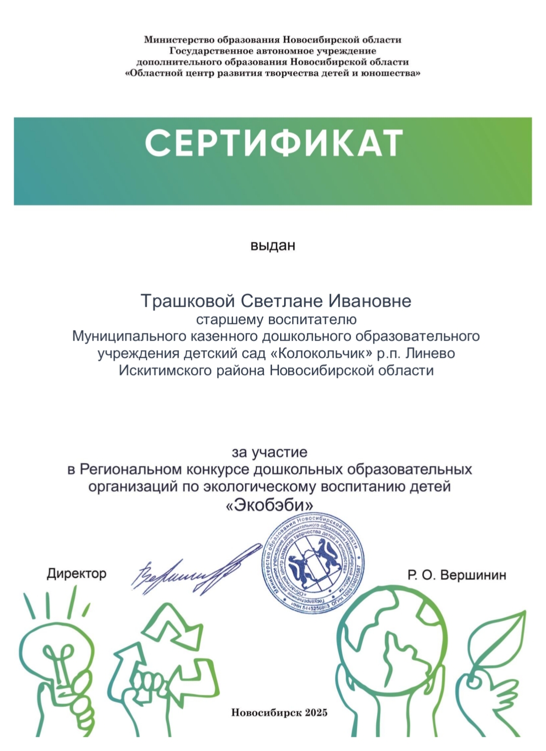 Сертификат Министерства образования НСО ГАУ ДО НСО "Областной центр развития творчества детей и юношества", региональный конкурс ДОО по экологическому воспитанию детей "Экобэби", Новосибирск, 2025